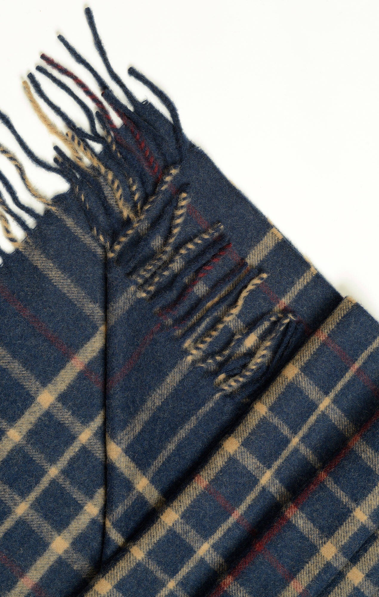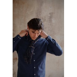 Scarf with a navy, beige and rust check pattern on a navy background: a very soft fabric made of camel wool, a fabric almost as soft as our cashmere scarves. A scarf made in the Italian Piedmont.