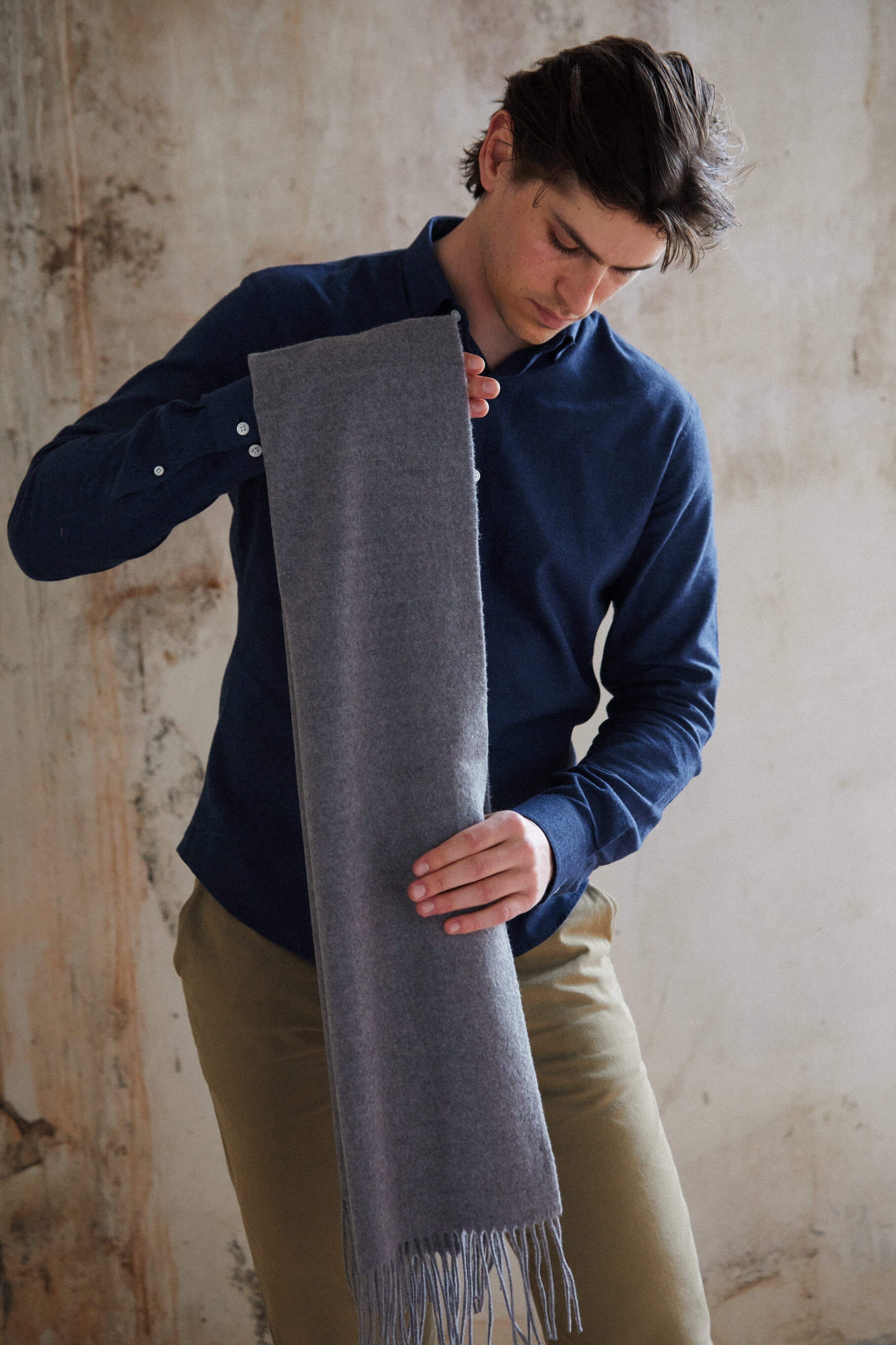 A plain grey scarf slightly mottled in a 100% virgin wool. A classic. Made in a small workshop in Piedmont.