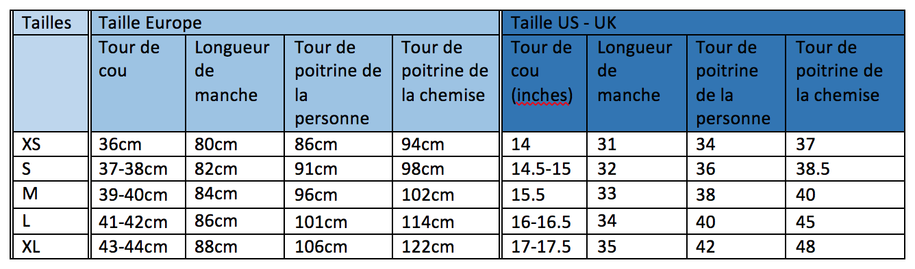 Les tailles de chemises sont très souvent déterminées par le tour de poitrine et la longueur des manches.