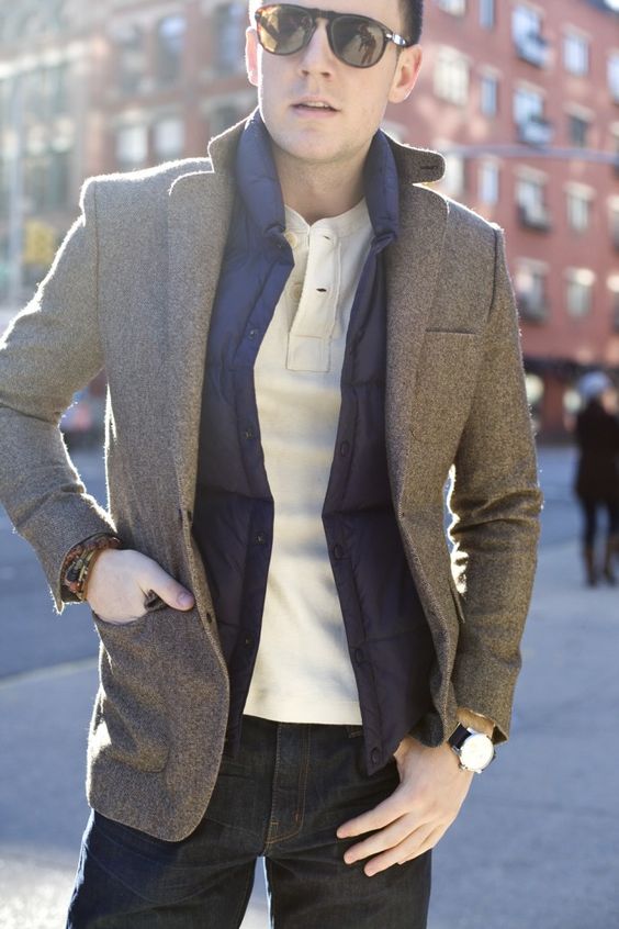 Sous une veste : celle-ci doit être décontractée, un peu ample. On lui associe un jean ou un chino pour un style travaillé mais pas formel, ainsi que des mocassins.