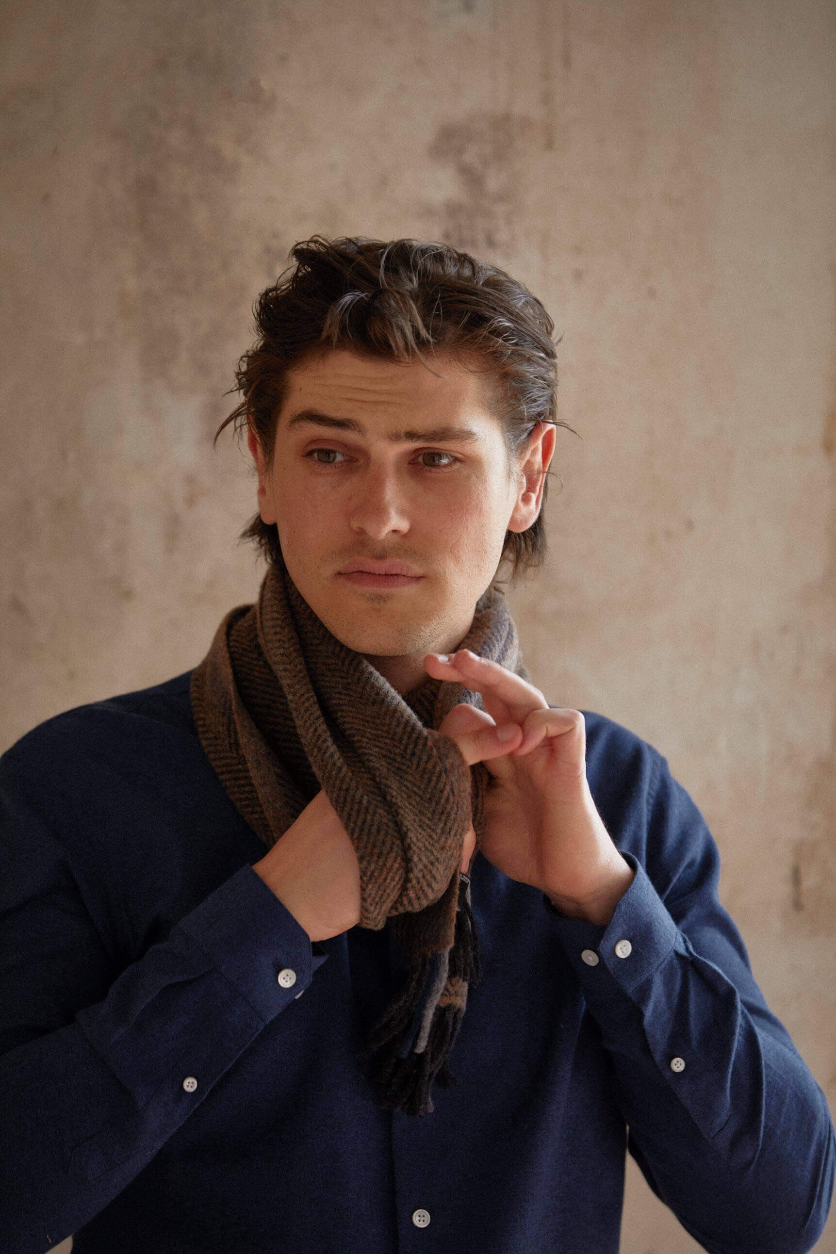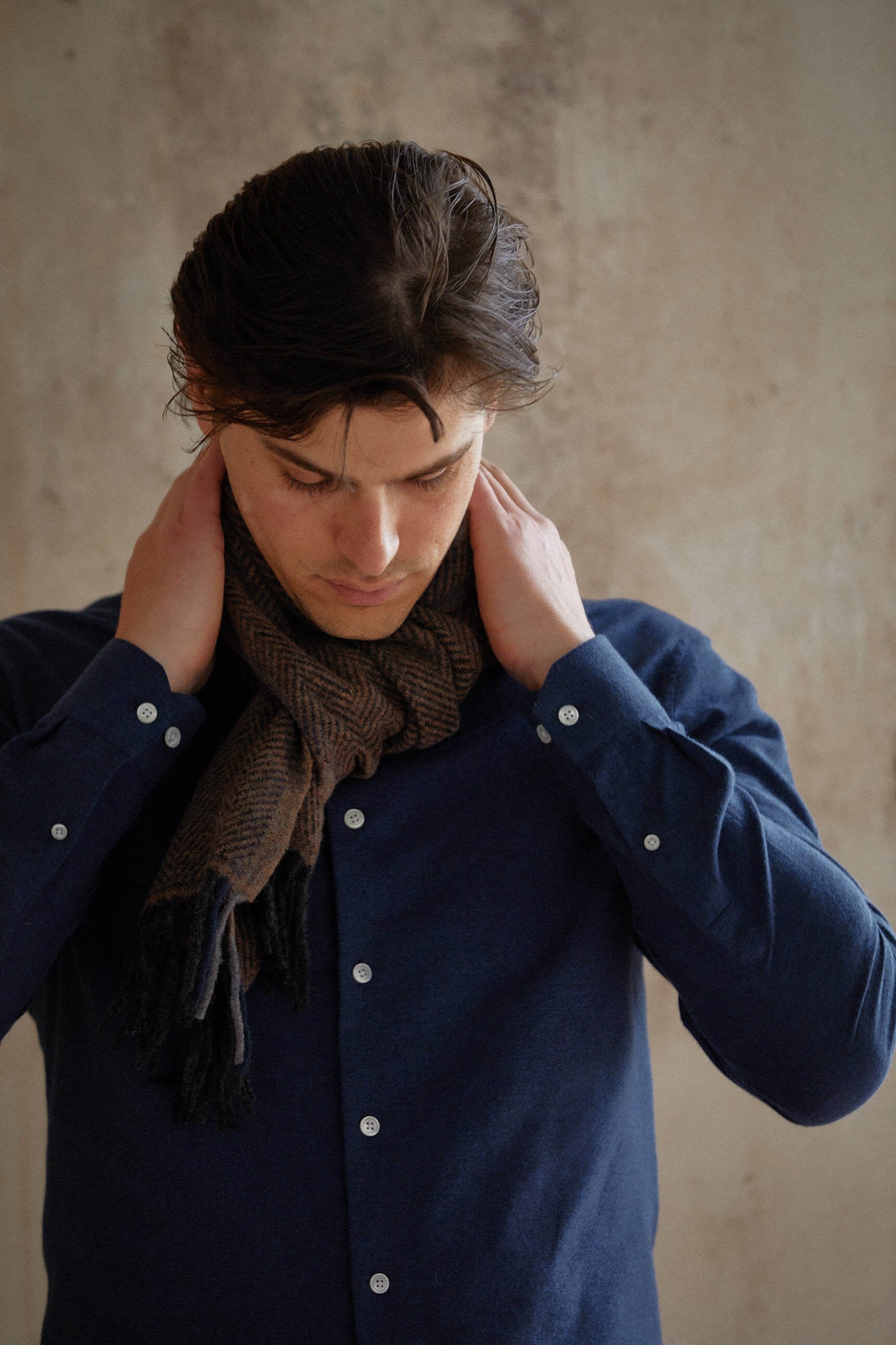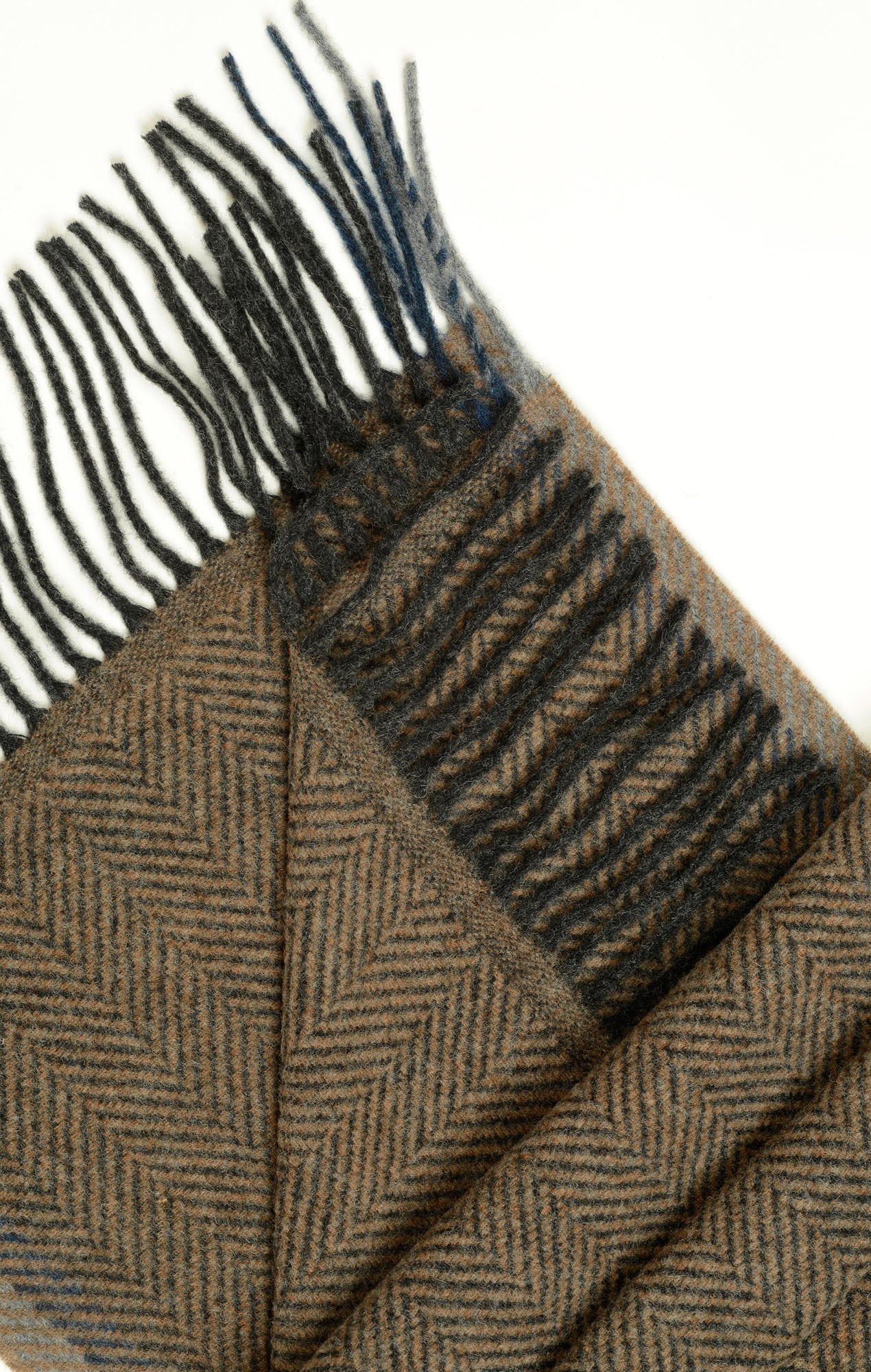 Echarpe à petits chevrons bruns et anthracites, 100% pure laine fabriquée dans le Piémont Italien.