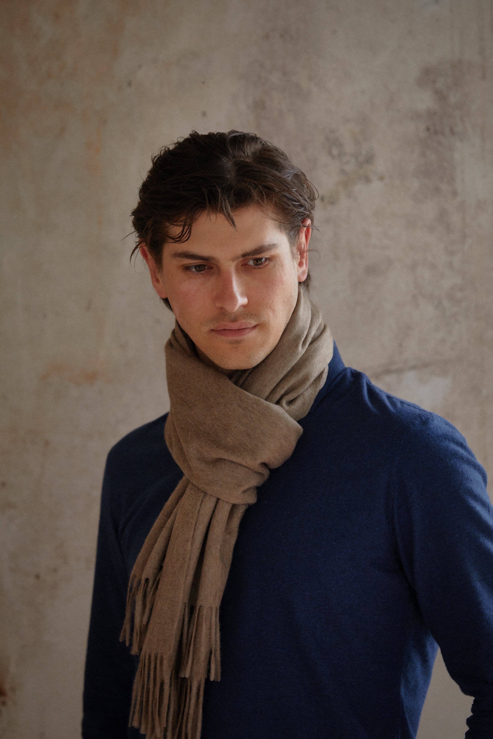 Exceptionnelle écharpe unie beige légèrement chiné dans un cachemire de zibeline : un tissu d'une douceur irréelle. Une écharpe fabriquée dans le Piémont Italien.