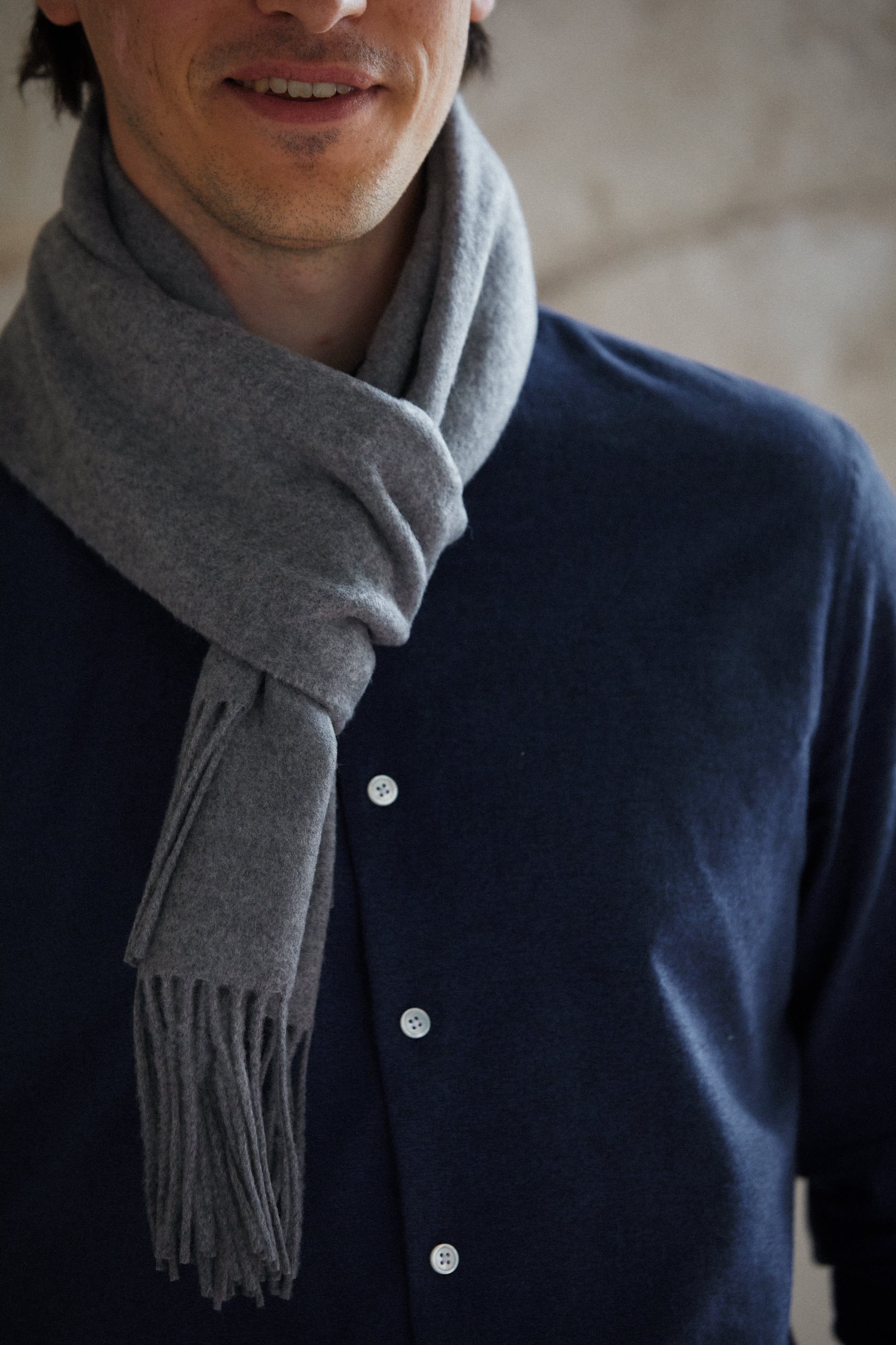 Une écharpe unie grise légèrement chinée dans une laine 100% vierge. Un classique. Fabriquée dans un petit atelier Piémontais.